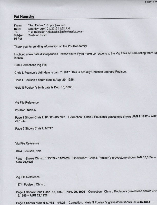 letter offering correction of dates in Vig entries of the Poulsen family